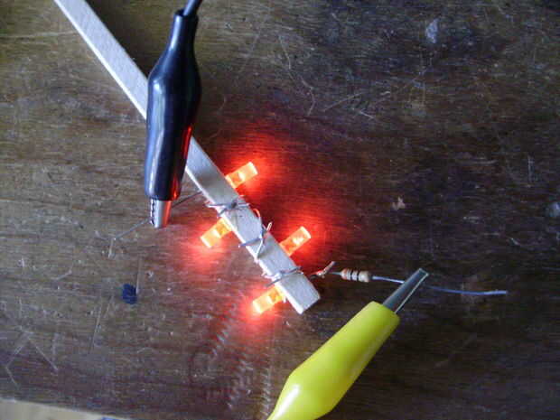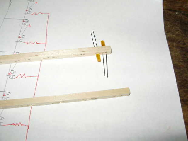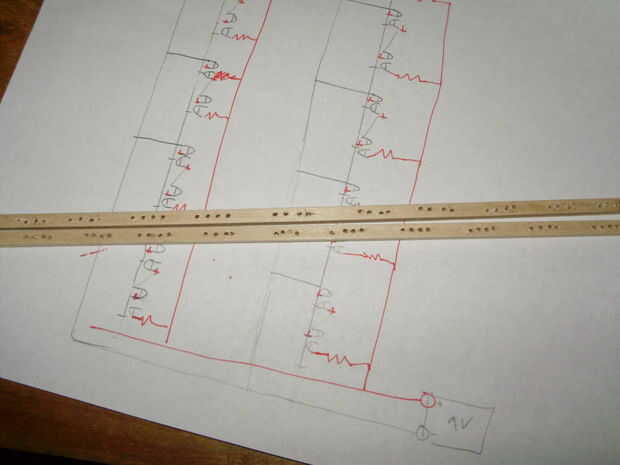 usé 4 tacos cuadrados delgados para hacer el marco de las luces.  Perfore agujeros de 40 1/16" juntas a lo largo de la longitud de cada espiga.  Debe espaciar así que lleva un LED puede caber en cada par de agujeros.  Para el espacio uniformemente el LED, taladre los orificios en conjuntos de cuatro-uno dirigido a cada lado de la espiga por el sistema.  Montar el LED a través de los agujeros, alternando lados.  Asegúrese de que el LED se orientan positiva a negativa entre cada uno.  Cada par de positivos juntos del LED al negativo de la soldadura.  También Únete cada dos pares de LED de la misma manera.  De cada 4 LEDs Solde un resistor al positivo de la primera resistencia en la cadena.  4 LED y el resistor en serie de una hacer un nodo de las luces.  Cada espiga tiene 5 nodos en paralelo, y cada conjunto de luces tiene dos varillas en paralelo.