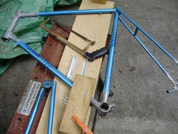 Para evitar el uso de una plantilla, es muy importante el orden en el que quitar los tubos de la bicicleta. Tienes que ser capaz de mantener la geometría de la moto para todo alinear y para la bicicleta de pista recta. Empecé quitando los tirantes de cadena. Quitando los primeros, las punteras son todavía sostenidas por las estancias del asiento, y ninguna otra parte de la estructura se ve afectada.