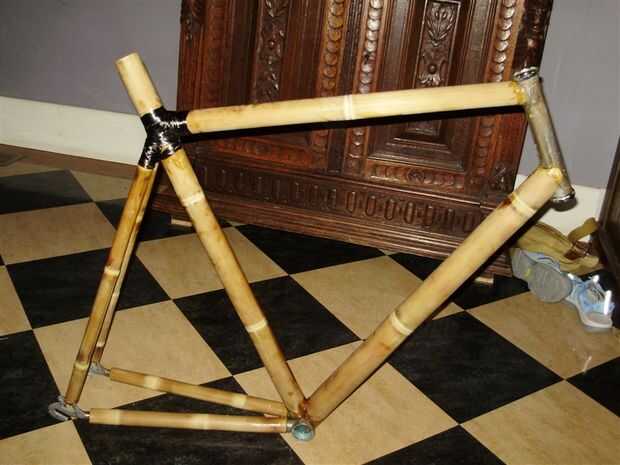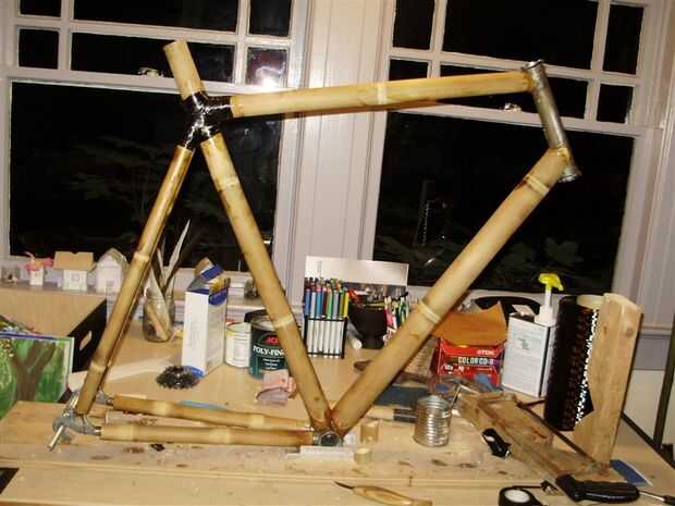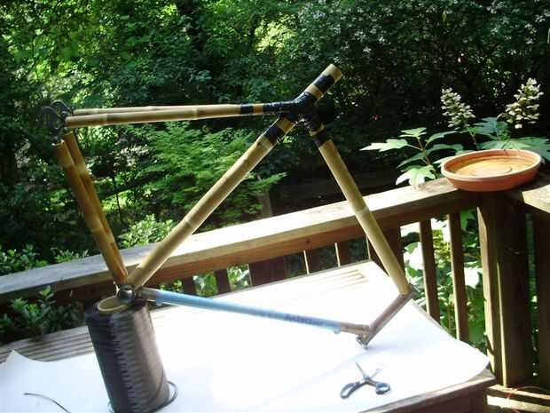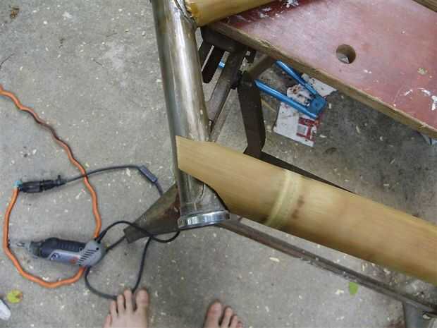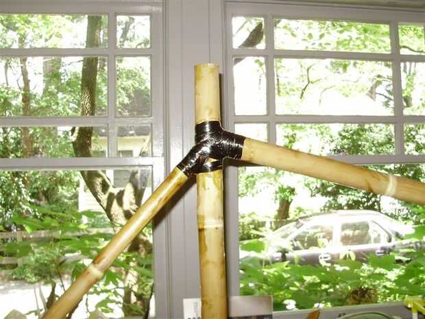 Elegí utilizar bambú de diámetro muy ancho el tubo hacia abajo. Me gusta como se ve, y agrega mucha rigidez a la estructura. El tubo diagonal inglete y tachuelas en el bastidor igual que los otros tubos.
