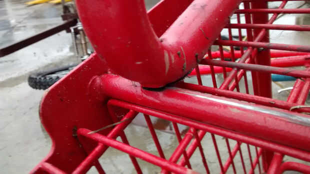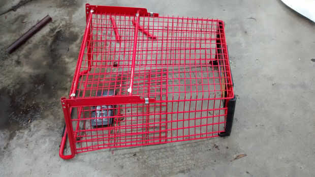 Quitar las ruedas de la cesta de compras por separando los soportes de la rueda de la jaula con la rueda de corte de la amoladora angular. Fui capaz de cortar a lo largo de las soldaduras y levante las piernas bien contra la jaula para un corte limpio. Rápidamente moler el área del corte con la rueda abrasiva para eliminar cualquier borde filoso.