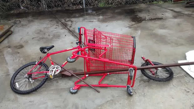 Diseño de la moto, shopping cart y horquilla delantera en el suelo para determinar proporciones y asegúrese de que todo encaja. La imagen muestra la disposición áspera para la bicicleta que construyó [aunque no quité la deja de la cesta de compras, que acaba de hacer las cosas más difícil]. Usé una combinación de expansión en el concreto como una línea de referencia para obtener la ubicación de la cesta de la compra y rueda delantera correcta en relación con el resto de la estructura. Esta línea de referencia actúa como los orinques cuando la moto está en su lado. La rueda trasera de la bicicleta debe apoyarse en esta línea con la vaina en paralelo a la línea. La parte inferior de la cesta de compras debe ser paralela a esta línea también. La rueda delantera se apoya también en la línea, pero la horquilla se puede inclinarse ligeramente hacia atrás para acortar la moto. La horquilla delantera debe quedar casi vertical para los trabajos de dirección.