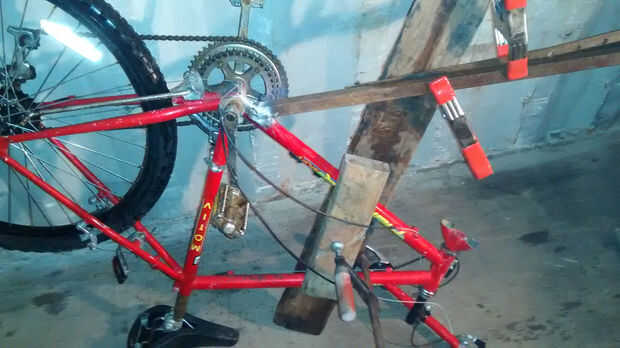 Crear una plantilla para fijar el tubo mientras que soldarlo a la estructura. Usé una tabla corta y un tablón largo a ambos lados del marco para crear una superficie estable para fijar [ver imagen]. Soldar el tubo y ahora tienes una bicicleta con ruedas justa.