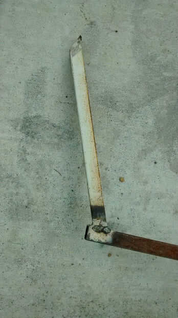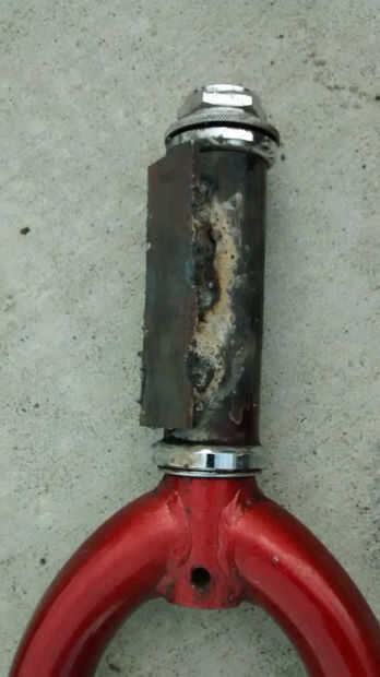 Colocar otra vez la moto y la horquilla delantera contra el tubo corto, comprobar la altura y el ángulo de la posición. El ángulo del extremo del tubo corto deba corregirse [por corte o pulido]. La abrazadera y la soldadura! [ver imagen]