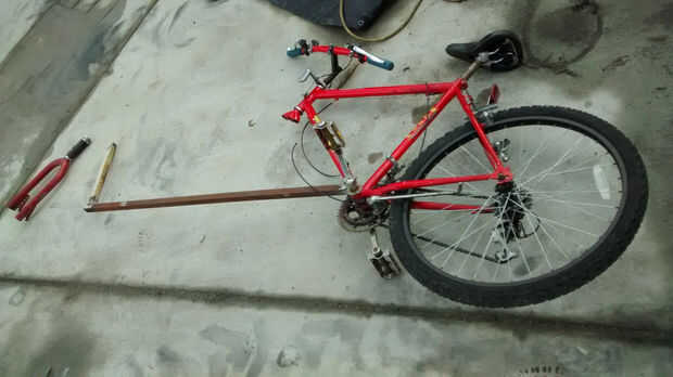 Para evitar que la bicicleta plegable para arriba en sí mismo, añadir un tubo entre la parte superior del tubo hacia abajo de la bicicleta y el tubo largo. Colocar la bicicleta [una última vez, prometo] y marque el ángulo de corte [ver imagen]. Configurar el ángulo de la barra para que coincida con el ángulo de la barra de dirección puramente por razones estéticas. Cortar, montar, moler y soldar.