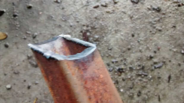 Tomar la bifurcación delantera y moler piso los talones de la estructura que sobresalen de la barra de dirección. Cortar un trozo de barra de acero plana placa plana para el mismo ancho y largo como el tubo de dirección. Esto mordaza contra los tocones de tubo aplanado marco y soldar en su lugar [ver imagen]. Esto crea una fuerte superficie plana que puede soldar con autógena con el tubo corto.