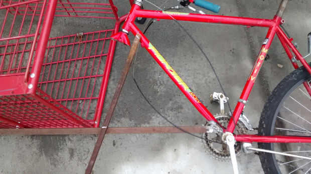 El tubo corto conecta el tubo largo que corre debajo de la cesta de compras para el tubo de la horquilla delantera. Colocar la moto en el suelo otra vez, coloque el tubo corto y marca para el corte. El tubo corto debe terminar en la parte superior en el largo del tubo [ver imagen] dejando suficiente espacio para el carro de compras entre la bicicleta y el tubo corto. 1 a 2 pulgadas de longitud en el tubo largo permite esta distancia a ajustarse. La horquilla delantera debe ser ligeramente en ángulo con suficiente espacio entre el tubo corto para que la rueda gire libremente. Mida nuevamente y corte el tubo con el ángulo para que coincida con la parte superior e inferior donde se encuentra con los otros tubos. Sujetar y soldar con autógena el tubo largo. Las dos barras ahora crean una proyección de 'L' doblado de la parte delantera de la moto. [ver imagen]
