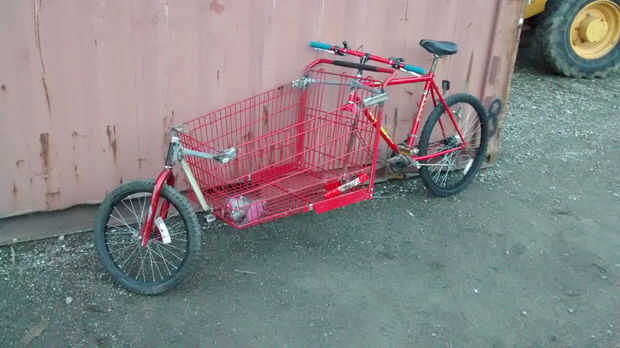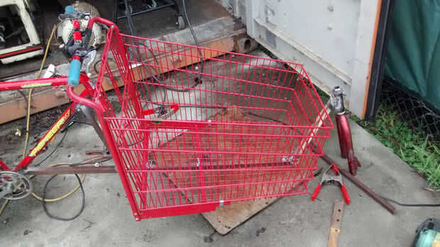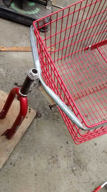 Crear otra llave en la parte trasera de la cesta de compras para conectar en el tubo de la bicicleta. Mismo proceso, otro lugar, el segundo es más fácil. Esta soldadura en su lugar [ver imagen]. Ahora parece que una bicicleta de carga!