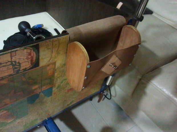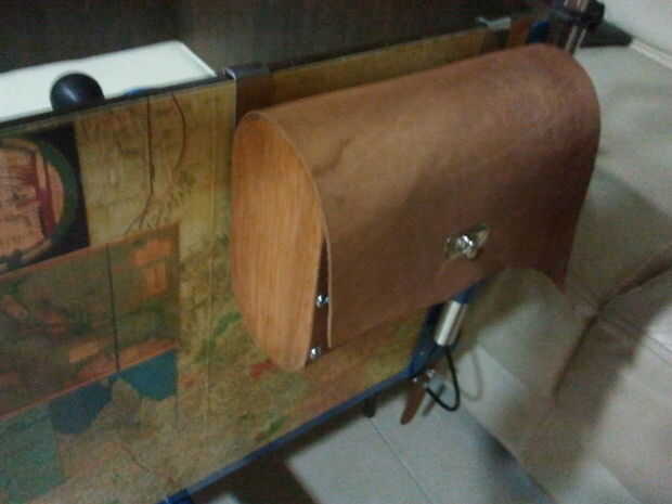 Monedero hecho de herramientas de madera y cuero. Barra de cinta de cuero y silla de montar forro de cuero cuadro 3 el curioso nombre del mapa: la cabina (el cajón). 6. cuadro que todos los cables están ocultos dentro de la manija. cuadro 7 dentro del cajón le puse un cojín para perro.