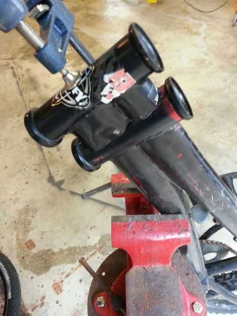 Poco a poco y en varios pasos, recorte el tubo adicional para adaptarse a la estructura de la bicicleta. Primero recorte lo para que no toquen los engranajes, luego poco a poco molido más lejos para hacer un buen apretado ajuste de los dos tubos principales junto con una malla apretada de los engranajes. Cuando esté satisfecho con el ajuste, desarmar todo y soldadura o soldar el tubo extra sobre el armazón.