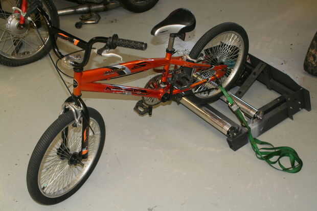 Poner la moto en! Usando los dos amarres, conjunto de la parte trasera neumáticos sobre los rodillos y colocar un lazo en las estancias de cadena ya puede como se muestra en el cuadro 2. Hacer los amarres lo mas ajustado posible. Si tienes problemas con la rueda de deslizamiento, puede dejar algo de aire en el neumático, hacer los amarres apretado y luego aire el neumático hacia arriba.