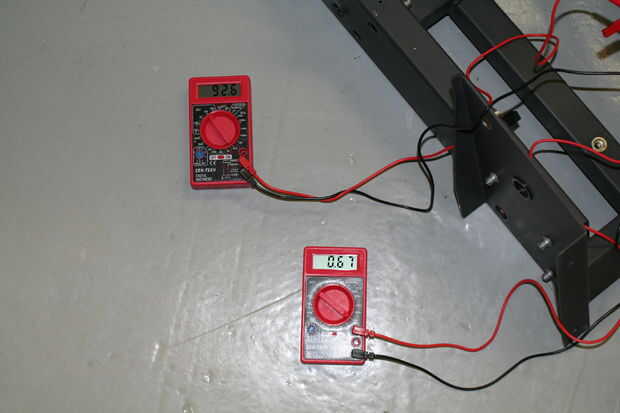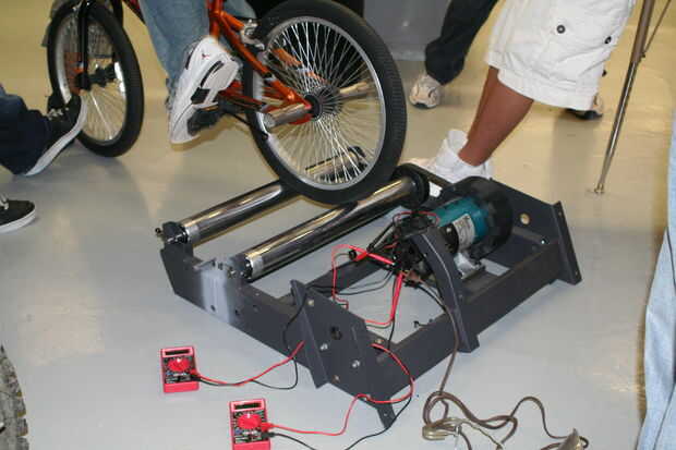 Puede ser difícil conseguir el dyno va-allí es un poco de inercia entre las ruedas, el motor y el volante del motor. Comience pedaleando despacio y construir poco a poco velocidad hasta que usted se pedaleo tan duro como usted puede. Que alguien vigile los dos multímetros y anote el número más alto visto en cada uno de ellos.