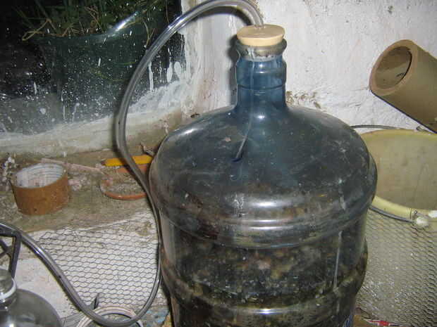 Este es el recipiente que produce las burbujas.  Utilicé una botella pop 2 litros y la levadura y el azúcar para el primero de ellos.    Trabajó.  Luego decidí utilizar desechos de cocina en un recipiente grande de agua.  Es unos 5 galones de tamaño y tiene una "boca" bastante grande que tuve que comprar un corcho de gran tamaño para él.