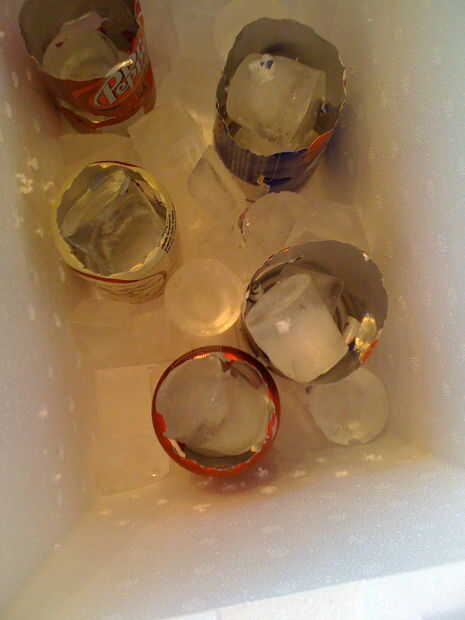 la mayor cantidad de hielo mejor, llenar sus cubetas de hielo, incluso poner pequeñas tazas de papel en el congelador para hacer hielo más. Poner el hielo en el refrigerador, tanto en el poder y que rodea las latas.