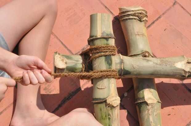 También creo que sería buenos saber porque usaron un poco el amarre diagonal y dos medios nudos. Todo lo que sé sobre nudos y amarre que aprendí en Boy Scouts. El folleto de insignia de mérito pionera es un buen recurso para la gente nueva para amarre.