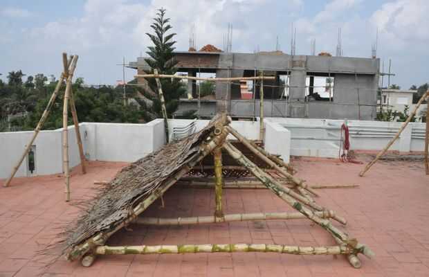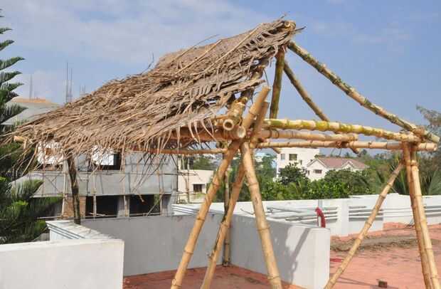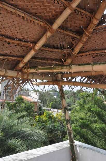 Como una medida temporal, construimos un par de trípodes y un marco que conecta a la azotea del edificio.  Esto nos permitirá disfrutar del dosel de sombra y terminar de añadir el material para techos en los lados que son fácilmente accesibles por escalera (no queremos añadir todo y hacerla demasiado pesada para levantar tan sólo poner en los lados que no podríamos hacerlo sin correr el riesgo de caerse el techo.)  Mientras decidimos qué tipo de columnas a utilizar podemos todavía apreciar ahora podemos estar en el techo al mediodía y disfrutar de la brisa mientras no ser perseguido apagado por el calor quemaduras.