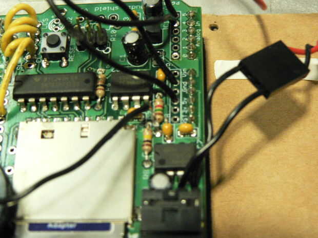 Conecte el cable que soldamos al principio de este Instructable de resistor R7 en el Waveshield con conector de entrada analógica 1 los TLC control Freeduino (este cable es para comprobar el volumen de las palabras pronunciadas por el Waveshield y no es parte de la interfaz I2C). (Ver imagen de aclaración)