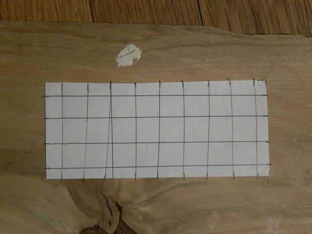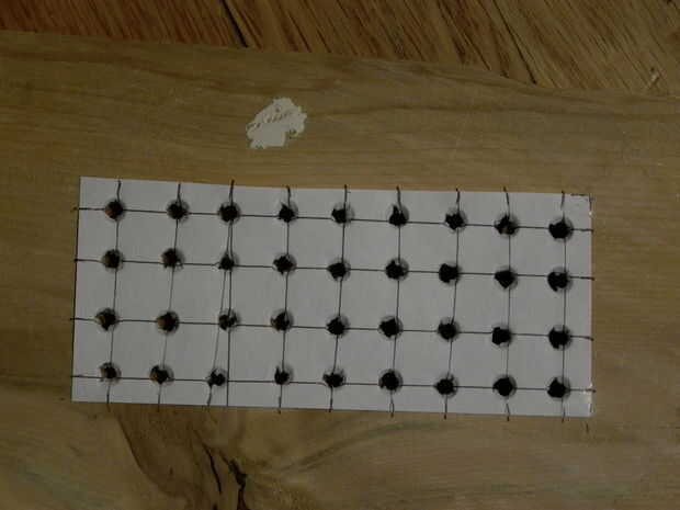 Después de haber hecho esto, la cinta el pedazo de papel un trozo de madera y teniendo cuidado de no perforar el piso (esto me ha pasado por lo que recomiendo la perforación en la parte superior una caja de cartón.) Perforaciones donde se intersectan las líneas con 1/4 de pulgada broca, para que sus LEDs ajustarse perfectamente. El tamaño de la broca depende obviamente del tamaño de tu LED así que utilizar una broca más pequeña para el más pequeño. (Empezar con poco y trabajar su manera para arriba!) Ver fotos 2 y 3 de aclaración sobre la perforación/marca.