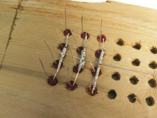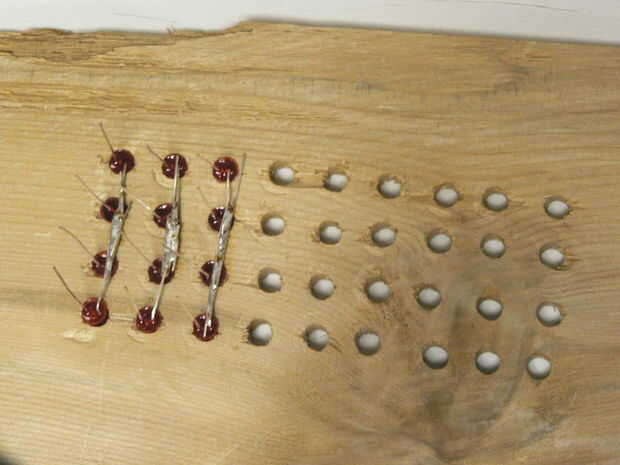 A continuación inserte la una fila de LEDs al mismo tiempo su perforado hacia fuera de la plantilla de cuadrícula. Doblar las piernas largas para que sean paralelas entre sí y soldarlos, fila por fila (ver fotos 2 y 3). Soldar entre sí las piernas largas ya que va a utilizar el sistema TLCs para controlar estos LEDs, lo TLCs son sumideros de energía. Esto significa que ellos controlan los LEDs alterando el voltaje diferencial entre alimentación y masa.