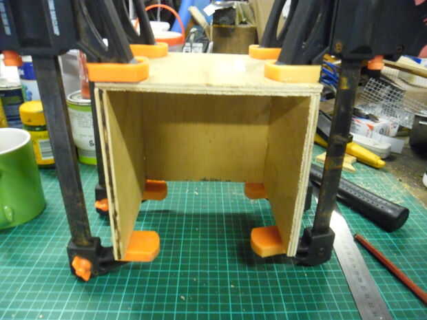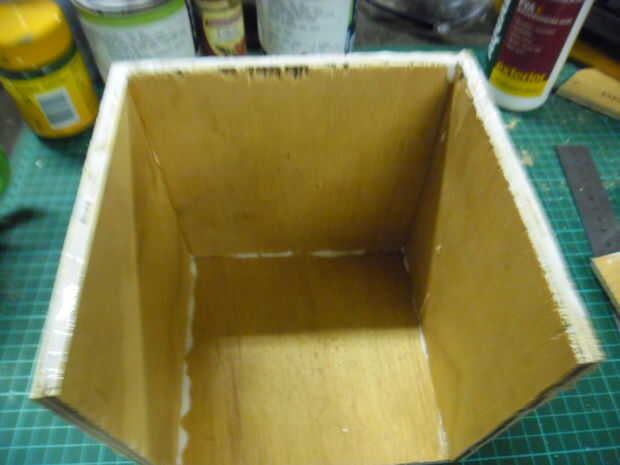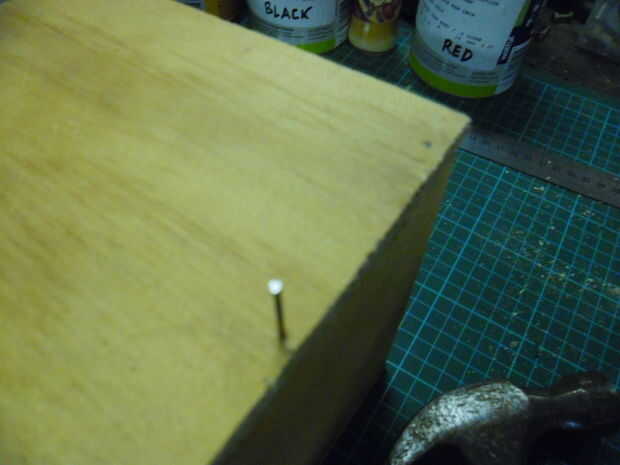 Coloque una gota del pegamento PVA en el borde del primer lado corto (15 por 15 cm) y fijarlo con la abrazadera a la parte posterior (15 por 15 cm) y laterales (15 por 16 cm) de la caja. Asegúrese de que los bordes se alinean correctamente y que las abrazaderas estén firmes. Limpie cualquier exceso de pegamento PVA con un trapo. Ahora ir y pintar el siguiente color de tu personaje mientras el pegamento seca. Una vez que haya secado el pegamento fijar el lado con tres clavos para asegurar que la caja es resistente.
