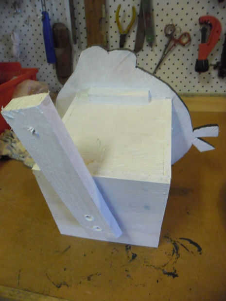 Estamos casi allí ahora. Dar a las piezas sin pintar en la parte posterior de su caja, las calas y la parte posterior del personaje, una capa de pintura blanca para proteger la madera.