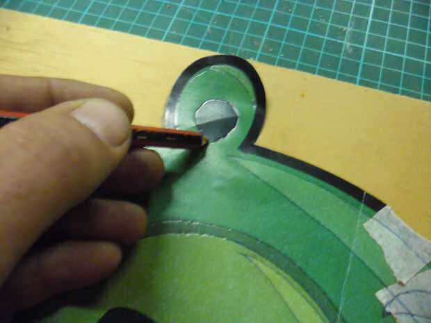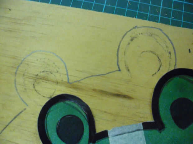 No que tienes la plantilla listo darle la vuelta y se coloca sobre la madera contrachapada, puede ayudar a fijar con un par de trozos de cinta. Una vez en su lugar utilice un lápiz o bolígrafo para trazar todas las líneas externas e internas de la plantilla. Asegúrese de pulsar muy difícil como quieras el grafito / carbón / carbón de papel bien en la madera contrachapada. Si las líneas son un poco débil rastro sobre ellos con un lápiz. Usted necesitará estas líneas para recortar y pintar a tu personaje.