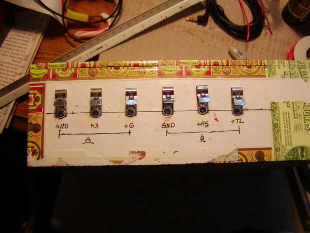 El cable negativo de la batería B a 4 terminal de soldadura, suelde el cable + 45 voltios a la terminal 5 y finalmente suelde el cable + 72 voltios al terminal 6. Utilice algunos trozos de cinta aislante para sujetar los cables sueltos en el interior de la caja.