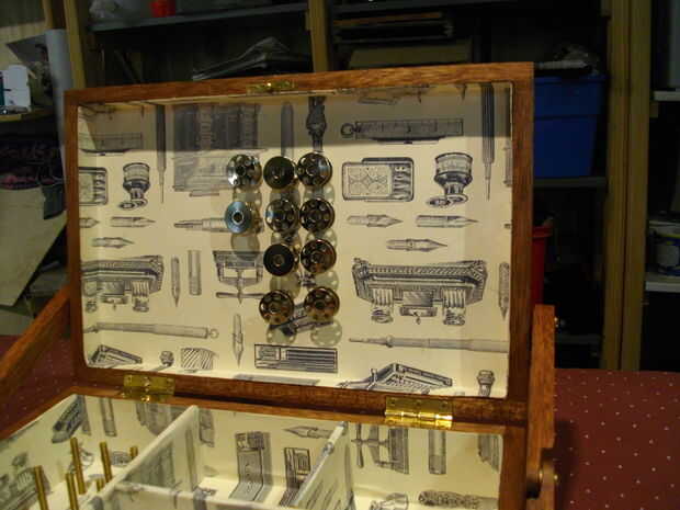 Instalar cualquier accesorios que tienes, yo puse en los titulares de la bobina magnética (x12), titulares de carrete de latón (x12), un bloqueo, 2 bisagras y un aguafuerte de latón con incrustaciones de un gato.