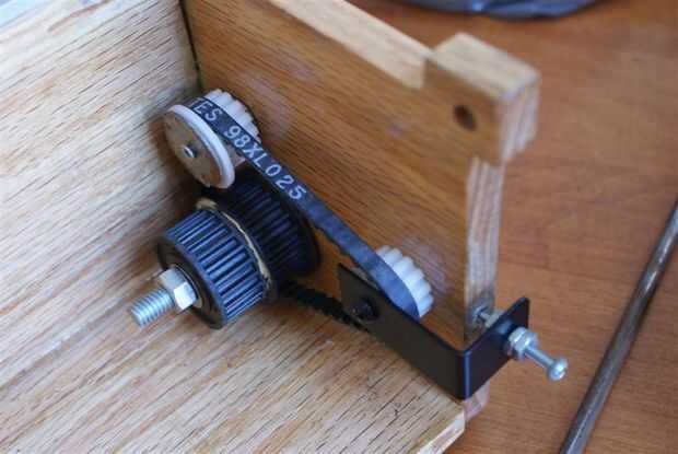 He encontrado algunos engranajes plásticos que malla correctamente con la correa de goma de 8" que tenía para el tambor. Pegan dos de los engranajes y pegado un largo perno en un agujero que perforado a través del lado de la caja. En el extremo de la caja, perforó un agujero y me pega una tuerca en él. Esto permitiría que me Inserte un tornillo de máquina con una armadura de cautiva, que llevó a cabo una marcha en el extremo. Esto me dejaría a tensión de una correa de transferencia para evitar deslizamientos de las correas y engranajes pero facilitan la manivela gire.