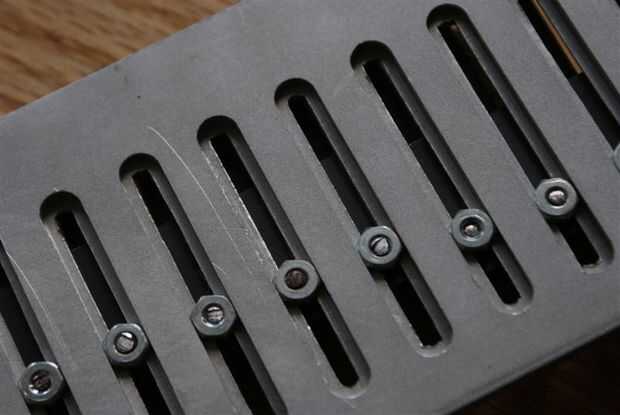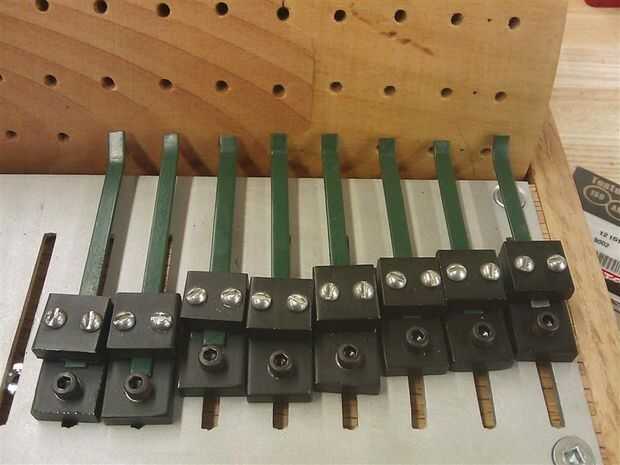 El diente, que es una pieza de acero de un rastrillo de la hoja, se intercala entre dos placas de aluminio. El diente está doblado en la punta y es aproximadamente la longitud debe ser, además de suficiente longitud que se celebrará en las placas firmemente. Esto se asegura con dos tornillos pequeños que pasan a través de la placa superior y en los orificios roscados en la placa inferior. La placa inferior luego se sienta encima de una placa de aluminio grande con ranuras mecanizadas en él. En la parte inferior están las ranuras más grandes con las tuercas cautivas en ellos, mantiene en su lugar contra la parte superior de la caja de música. Un tornillo pasa a través de un orificio en la segunda placa y en una de las tuercas para que su posición puede controlarse al deslizarlo hacia arriba y hacia abajo en la ranura.