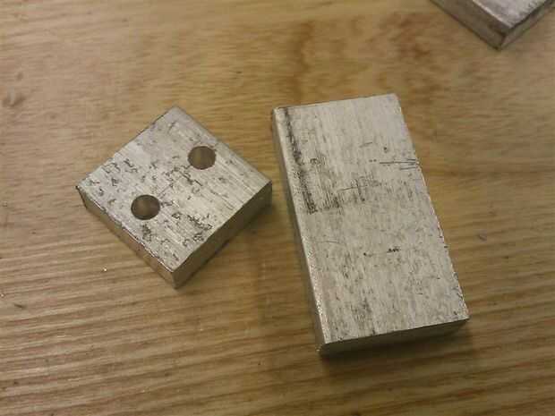 Para construir los soportes de tine, utilicé 1" ancho 1/4" espesor aluminio stock. Puesto que sólo tenía 15,3 mm de espacio por diente, corté las piezas de hasta 15 mm de ancho y luego en 15 mm y 30 mm largo segmentos.