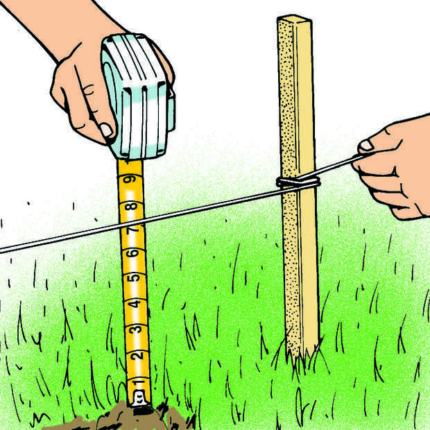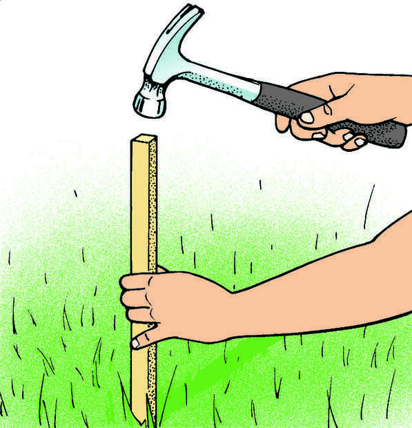 Ahora entrar en estacas de madera la hierba circundante (Fig. 4). Mantener las estacas aproximadamente 12 pulgadas lejos del borde del agujero y el espacio los cerca de 3 pies de separación a lo largo de la longitud de la caminata en ambos bordes. Tramo línea mason entre pares de estacas en toda la superficie de la calzada. Las líneas servirán como guías para medir la profundidad del agujero y la base. Ajuste la altura de la cadena por lo que es a una distancia uniforme sobre la superficie del suelo adyacente (Fig. 5). La altura de la cadena es arbitraria, pero debe ser lo suficientemente alto por encima del agujero para que no interfiera con su trabajo.