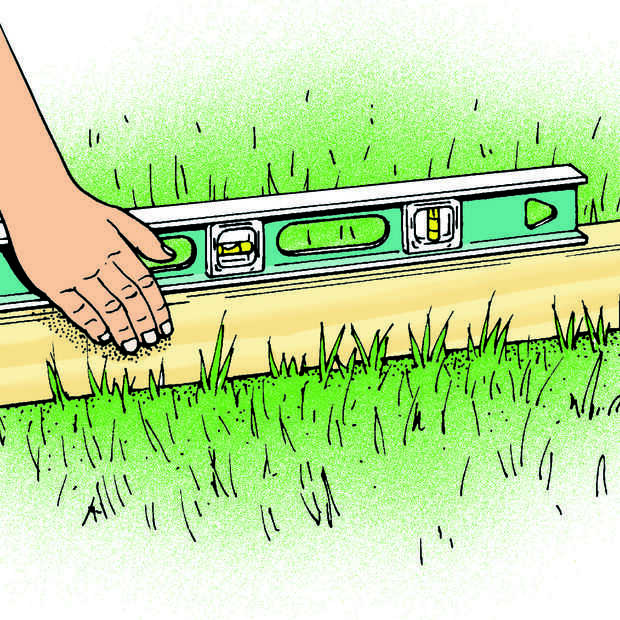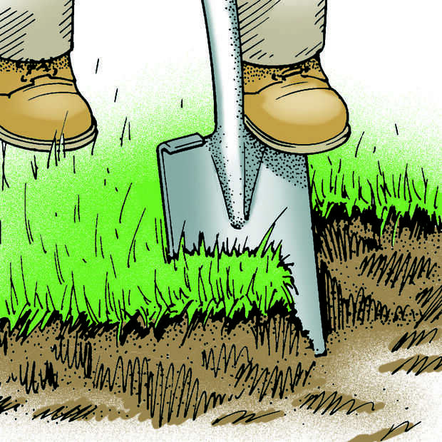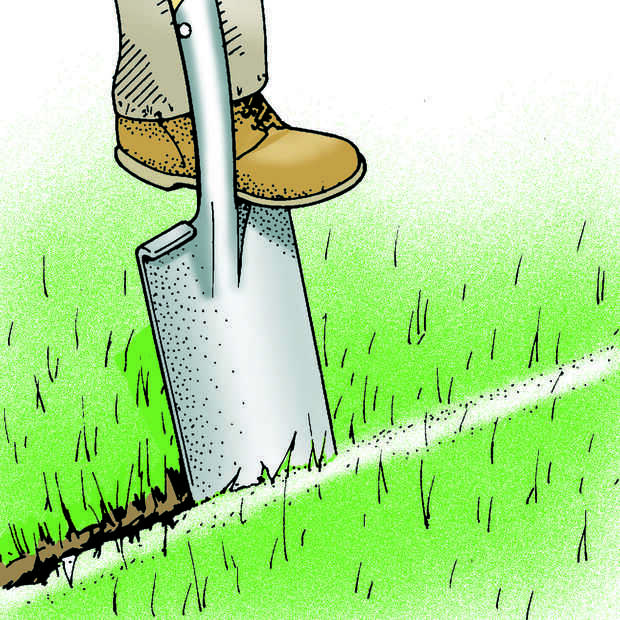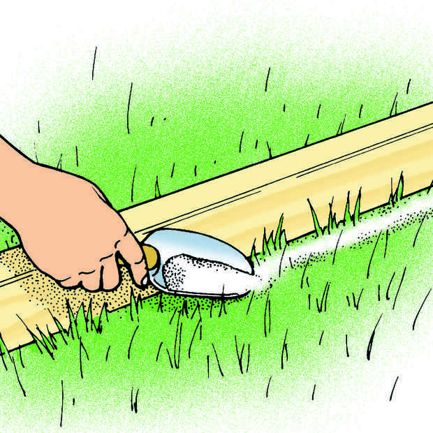 Determinar el contorno de la excavación de la pasarela. El orificio debe ser por lo menos 6 pulgadas más ancha que la caminata final en cada borde. Pone 2 largo x 4s en la hierba para indicar los bordes. Si la caminata debe ser curvado, puede utilizar un jardín manguera o cable pesado para marcar el contorno. Extienda una línea de piedra caliza de tierra justo en la frontera con motivo de la hierba (Fig. 2). Luego, retire los 2 x 4, usar una espada para cortar la hierba a lo largo de las líneas de distribución (Fig. 3) y quite el césped.