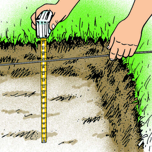 Continuar excavando el sitio de la caminata. Utilice la pala para cortar los lados del orificio vertical (Fig. 6) por lo que será la base de grava en su profundidad justo al borde del agujero. Verificar la profundidad del agujero, midiendo a las guías de cadena (Fig. 7). El fondo del agujero debe ser aproximadamente 7 1/2 pulgadas debajo de la superficie de la tierra. Trate de un agujero de fondo plano razonablemente. Si quita cualquier piedras grandes, simplemente llene los huecos con grava.