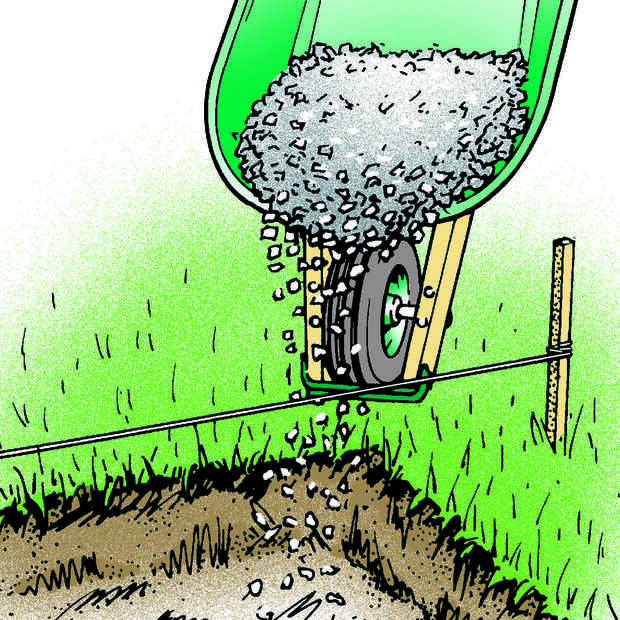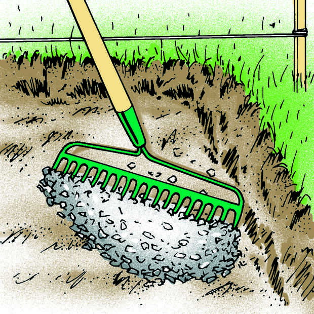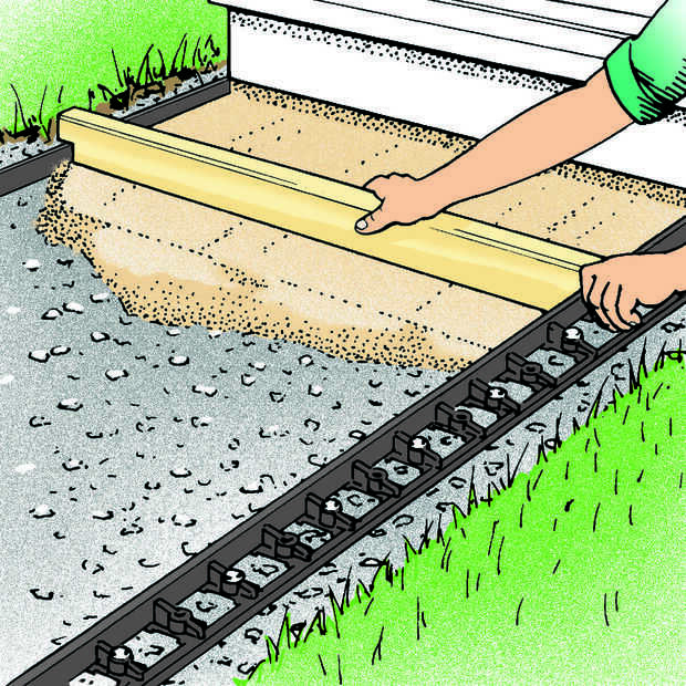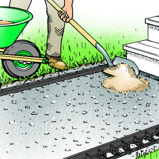 Aplique una capa de 1 pulgada de profundidad de arena sobre la base de grava (Fig. 7). Use un 2 x 4 para subbase la arena a una superficie lisa (Fig. 8). Si se corta una 1 muesca de 3⁄4 pulg de profundidad en cada extremo de 2 x 4, puede descansar las muescas sobre las restricciones de borde mientras tire el 2 x 4 por la arena.
