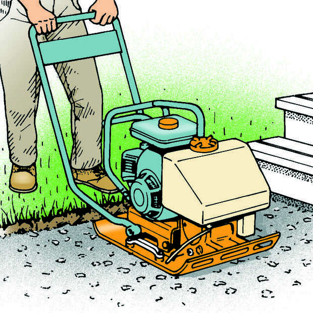 A continuación, usa la placa a paquete de la base de grava (Fig. 3). Mueva lentamente la máquina sobre la superficie varias veces. Adecuada compactación de la base impide que la caminata colocar más adelante.