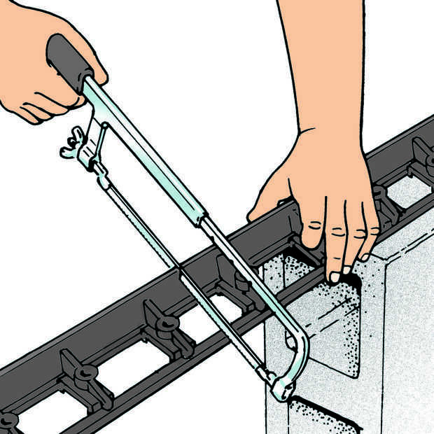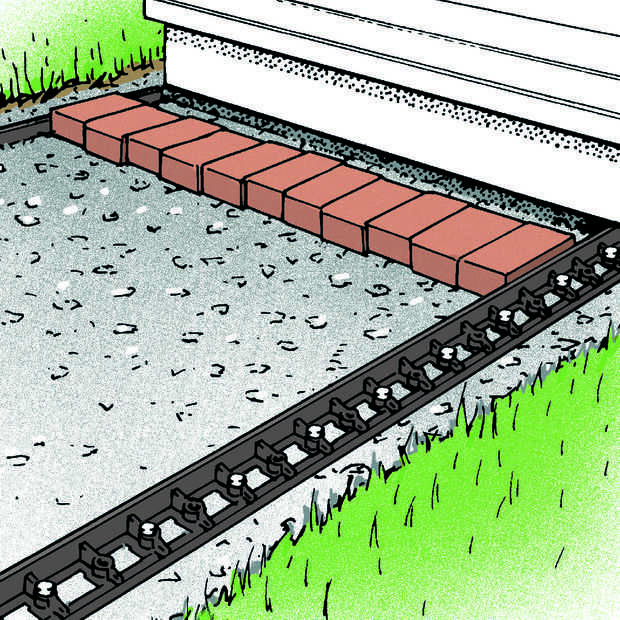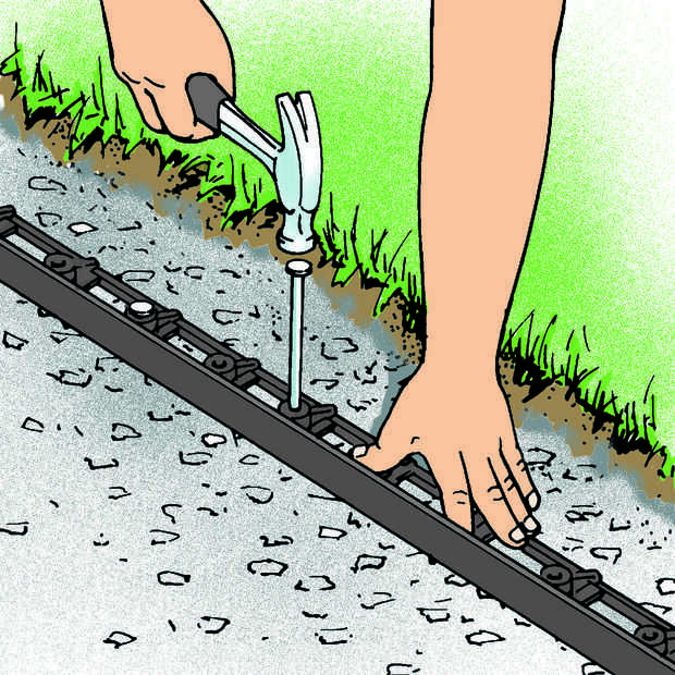 Coloque los bordes contra los ladrillos y manejar los picos de paisaje para trabarlo en su lugar (Fig. 5). Los picos de cerca de 3 pies de separación a lo largo de los bordes del espacio. En caso necesario, corte los bordes a medida con una sierra (Fig. 6). Si el recorrido tiene un perfil curvo, simplemente corte la cinta en el exterior de los bordes puede ser doblado a la forma requerida.