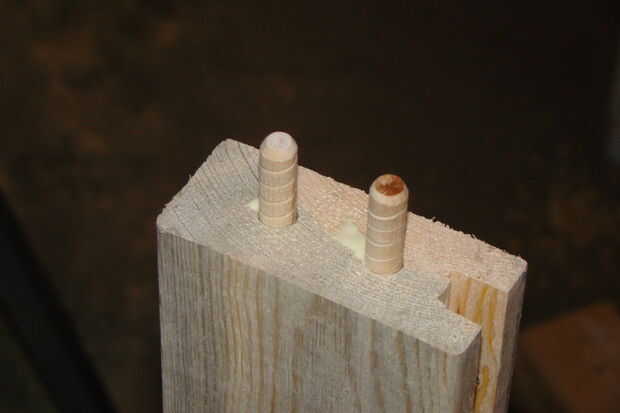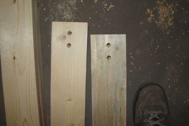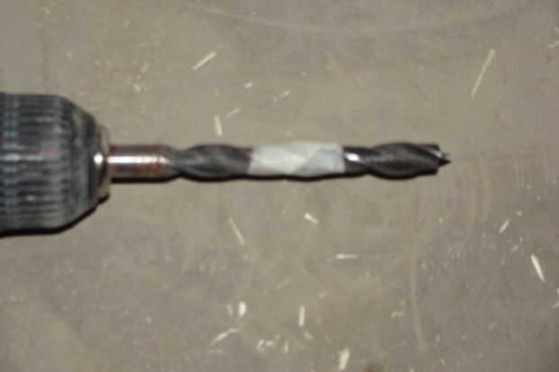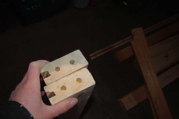 Perfore un orificio de 3/8" 1" y 2 1/4" de la parte superior de la 2 x 4 ranuras de centrado en cada extremo de la culata.  Realizar los orificios 1" de profundidad.  Una manera fácil para perforar agujeros profundos constantemente es poner un trozo de cinta alrededor de la broca a la profundidad correcta.  También Perfore orificios de centrado en cada post 1" y 2 1/4" de la parte superior y 13" y 14 1/4" de la parte inferior.  Pegar un taco en cada orificio en los extremos de la 2 x 4.
