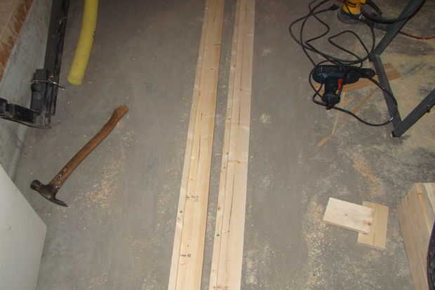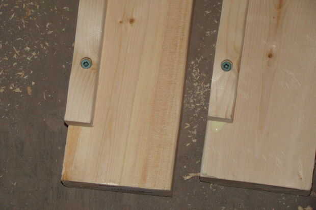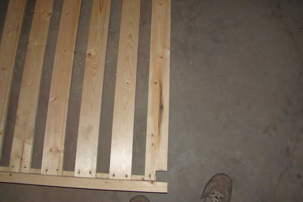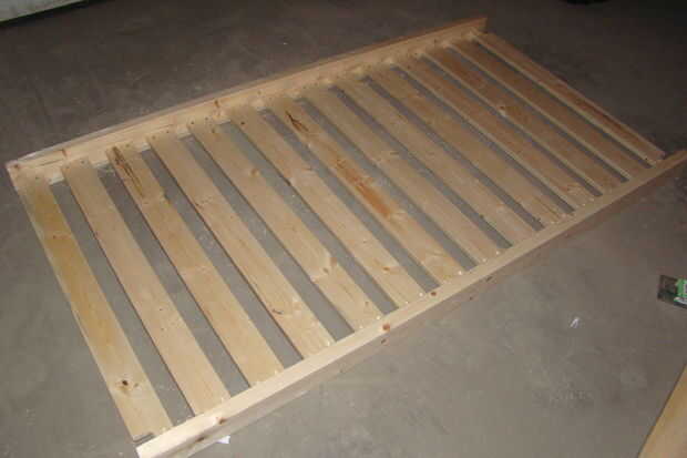 Marcar donde sus listones de apoyo (1 x 4 x 38") van a ir por cada 3/4" tira. Debe espaciar 2" aparte. Perforar agujeros y atornillar los listones en su lugar, pesca los tornillos para que pasen a la 2 x 4. Corte una muesca de 1 3/4 "x 1" en cada extremo de los listones de último para fijar el hardware de su cama. (Si está utilizando hardware diferente que yo que no necesita hacer esto) Arena.