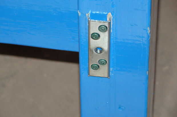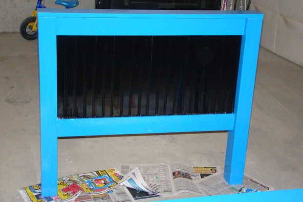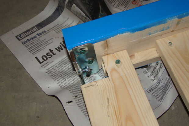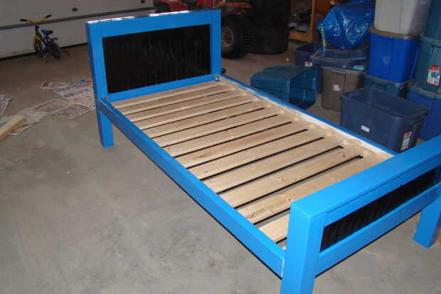 Hacer retoques con la masilla para madera si es necesario y cualquier lijado final y luego pintar su proyecto.  Fijar hardware de cama a los extremos del soporte del colchón y 12" de la parte inferior de cada post.  Fije el soporte del colchón en cabecera y piecera.  Eso es todo.