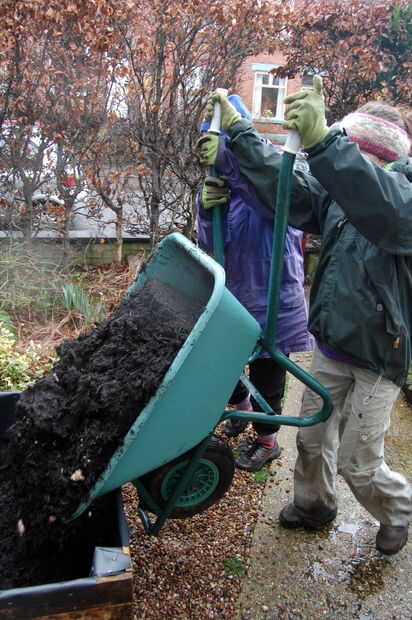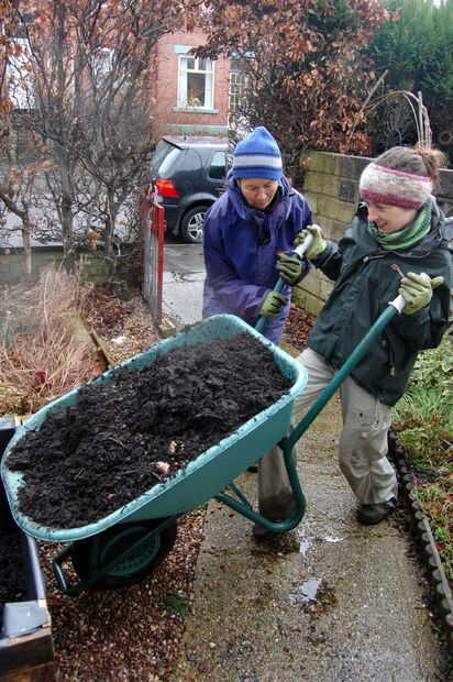 Es útil si usted tiene una cama que no es demasiado alto hasta la punta directamente dentro. Aquí estamos utilizando compost municipal desde el centro de reciclaje verde. cuesta alrededor de £40 por 1.2 metros cúbicos. es bastante barato. Es algo inerte que necesita traer vivo, añadiendo un poco de estiércol y compost hecho en casa, así como concentrados de: polvo, algas, concentrados de pollo de mierda, etc. de la roca. No reciben su compost de centros de jardinería en cargas de 20 kg bolso porque te costará una fortuna para llenar. Llevó a la cama en la foto 7 cargas de carretilla de rueda para llenarlo. Una vez completa con un espacio desde el nivel superior hacia fuera.