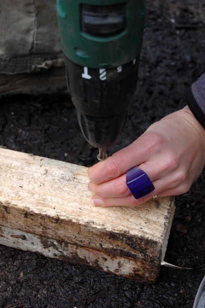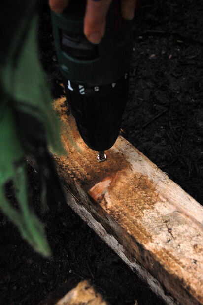 Aquí estamos atornillar utilizando un taladro de poder los pedacitos de poste de esquina de madera juntos - no se molesten con los agujeros piloto, acaba de obtener unos buenos tornillos y un taladro decente. Mantenga fuerza hacia abajo sobre el taladro y no perforar demasiado rápidamente, para que tengas control sobre él.  Repetir este proceso 4 veces hasta que tiene 4 esquinas.