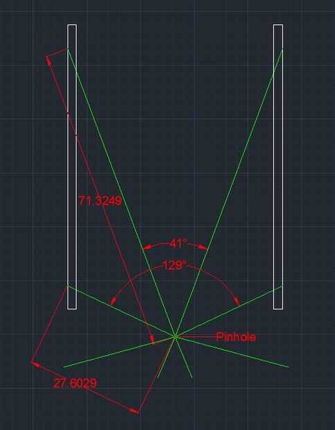 En cuanto al diseño de una cámara estenopeica anamórfico, hay algunas modificaciones a las reglas de diseño del agujero de alfiler. Básicamente, la longitud focal del agujero de alfiler debe ser en el otro extremo de la película, y al final cercano de la película debe ser dentro del cono de imagen máxima que produce el agujero de alfiler. El poro que utilicé es de 0,3 mm de diámetro y en material de 0.003", lo que resulta en un cono de 150 grados de imagen. El diseño resultante capta las cosas en la imagen de 41 de 129 grados del centro.