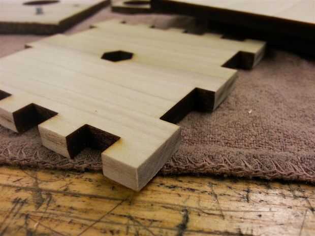 Las articulaciones de los dedos encajan realmente fácil para todas las juntas sean pegadas y fijadas fácilmente. Cortar tres 2,56" pedazos largos de 3/8" pasador y pulir 1/4" del extremo de las piezas para que encajen en el portacarretes con los orificios de la cara plana. Ver cuadro 4.