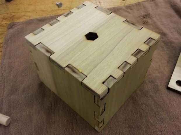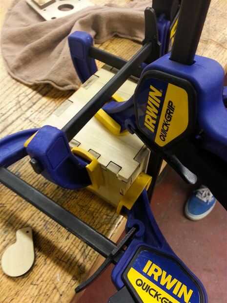 Pegamento el portacarretes con los agujeros redondos va en la parte inferior de la tapa de la caja, luego pegar los tacos en los orificios y pegar el otro titular de carrete en la parte superior.
