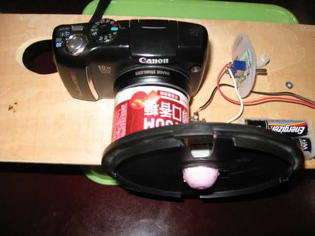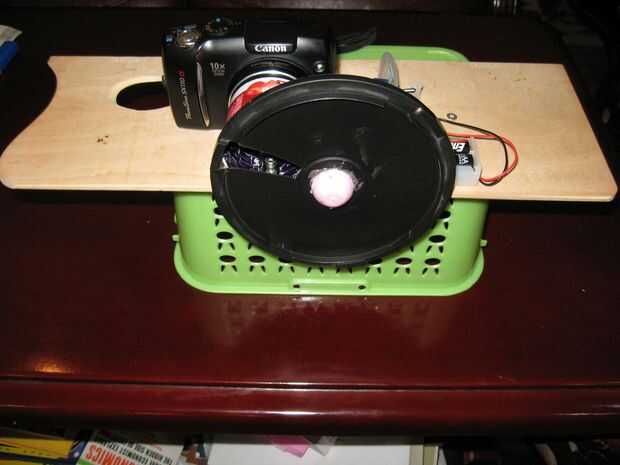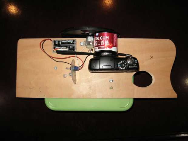 Cada cosa está atornillada a un trozo de madera contrachapada que se emperna a una cubo/cesta plástica que sirve como un trípode barato.