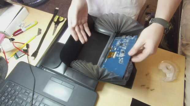 A continuación, abre el panel delantero y coloca la pantalla de modo que la luz brillaría a través del orificio en el último paso, luego con alguna cinta aseguró la carpeta. Si usted decide construir esta no tienes que usar la cinta, sólo la usé porque era lo que tenía fácilmente a mi disposición. Recomiendo usar tornillos o pernos para sujetarlo ya será más estable.