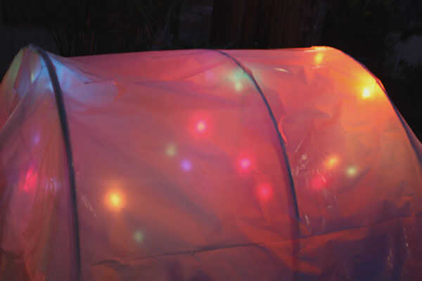 Este diseño requiere de dos o tres árboles (o ramas) en proximidad cercana. Se realizó a lo largo de varios fines de semana con madera nueva, tratada a presión para la estructura de soporte y el piso y una valla fue reciclada para los lados. El techo