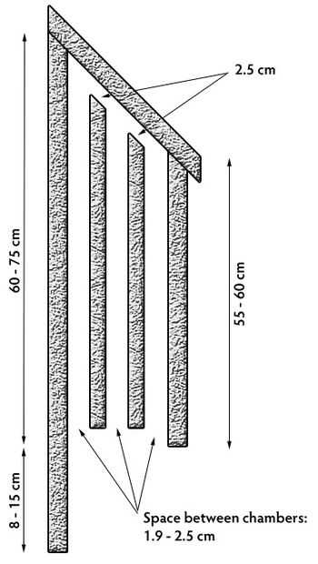 Las cámaras deben ser de 1.9 a 2.5 cm de espesor (murciélagos como espacios reducidos). Bafles de todos deben ser roughned, que murciélagos podrían agarrar de ellos mejor. Puesto que los murciélagos tienen solamente una garra poco por muñeca a aferrarse con cuando aterrizan, debe ser zona de aterrizaje áspero alto de 8-15 cm en la parte inferior de la casa de palo.