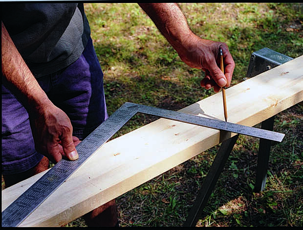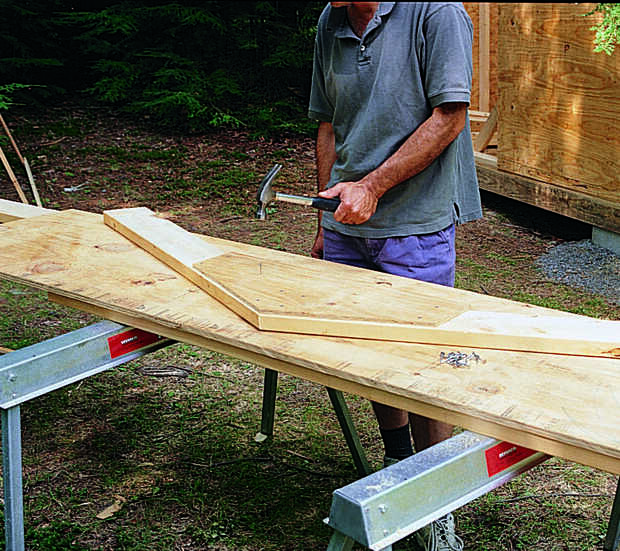 Corte un fuelle para cada truss de 1/2 en madera contrachapada gruesa como se muestra en los planos. Utilizar una hoja de madera contrachapada de 3⁄4 pulg como una mesa de montaje y dibujar el contorno de la cercha directamente sobre la superficie de madera contrachapada. Alinee dos vigas sobre el patrón y clavo la escuadra a las vigas con clavos de techar de 1 1/2-pulg (Foto 2).