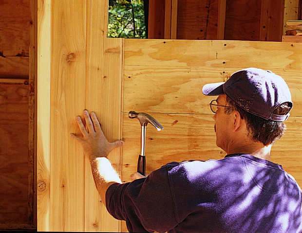 Si va a teñir o pintar la moldura un color diferente que la vertiente de revestimiento, es una buena idea para terminar el techo acabado antes de aplicar el revestimiento. Cortar a tableros de revestimiento y comenzar a instalar en una esquina del edificio. Uso galvanizado clavos para sujetar las tablas de acabados — 8d clavos para fijación a la estructura de 2 x 4 y 6d uñas para el revestimiento de madera contrachapada (Foto 2). Clavo la primera junta se enfrentan, pero fijar sucesivas tablas con clavos instalados diagonalmente a través de la lengua, por lo que las cabezas se ocultarán. Ajuste los pernos ligeramente por debajo de la superficie de madera.